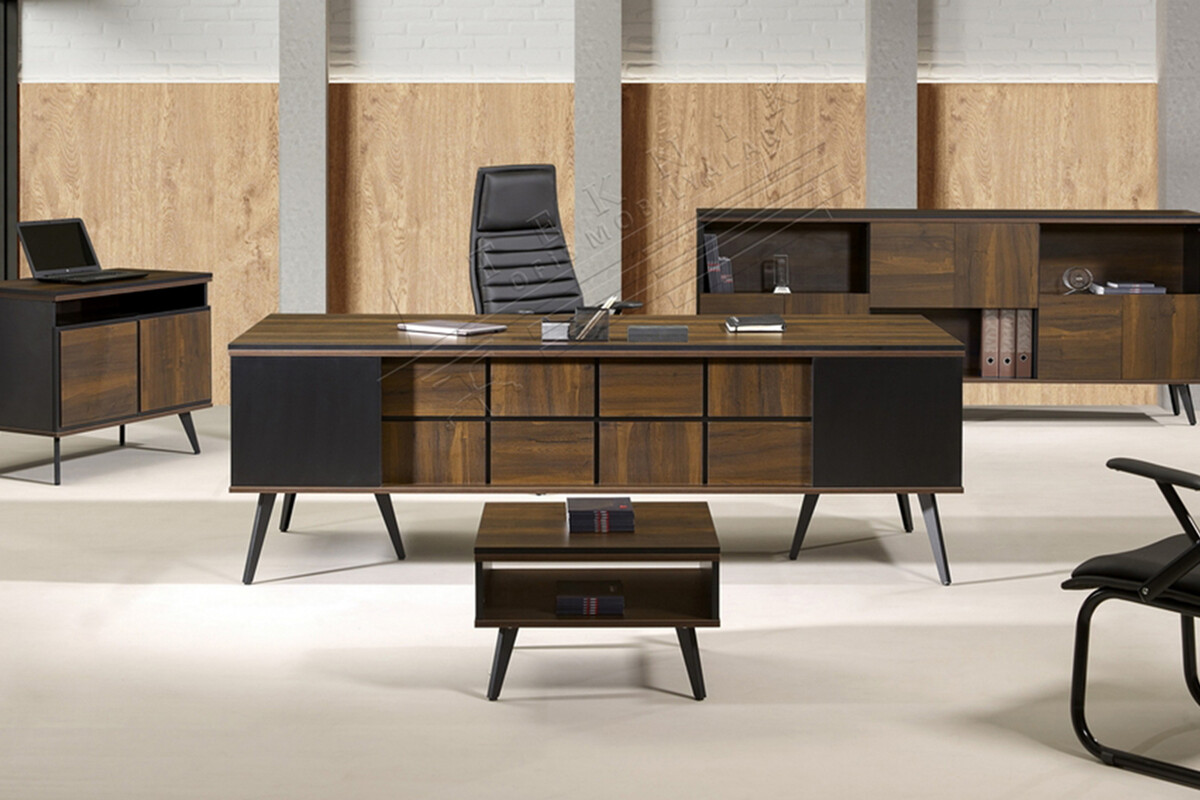 Pier Yönetici Ofis Takımı, yönetici ofisleri için özel olarak tasarlanmış, retro çizgileri modern işlevsellikle birleştiren kapsamlı bir mobilya setidir. Takımın ana parçaları, estetik bir yönetici masası, geniş depolama alanı sunan bir dolap, işlevesel bir etajer ve şık bir sehpadan oluşur. Masanın ve dolabın ön yüzeyindeki küçük kare detaylar, tasarıma özgün bir karakter verir. Bu takım, ofisinizde özgün, düzenli ve verimli bir çalışma atmosferi yaratmak üzere titizlikle üretilmiştir.