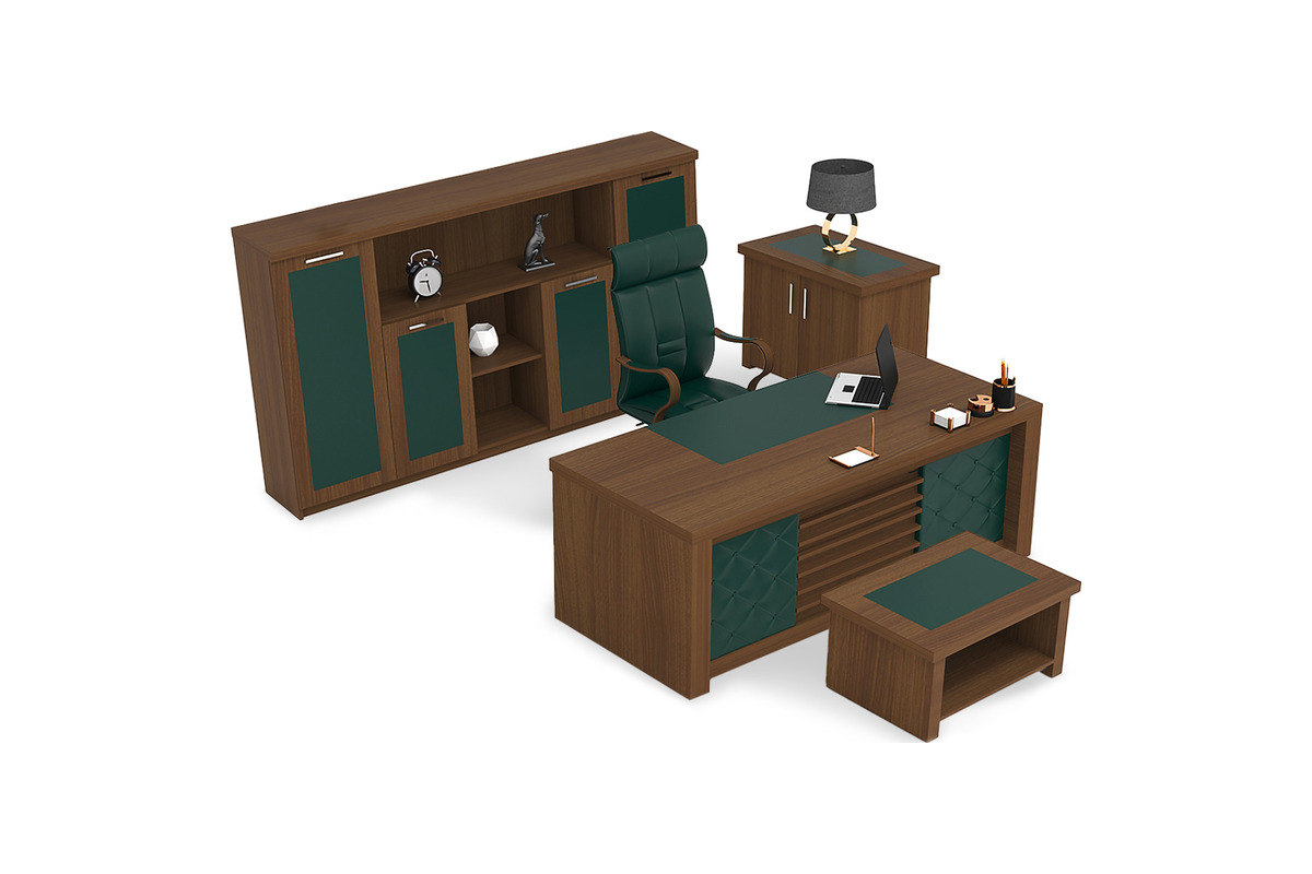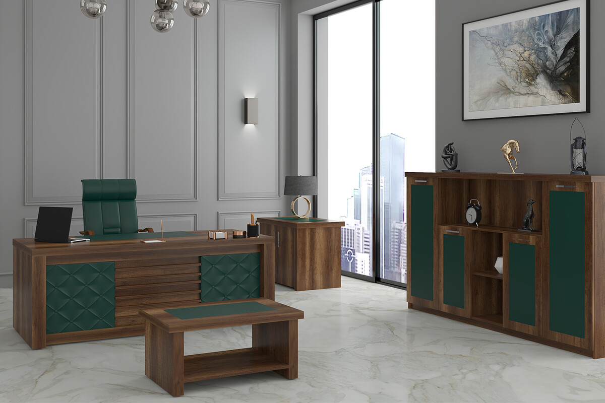 Ranses Makam Takımı, yönetici ofisleri için tasarlanmış, geleneksel çizgileri modern dokunuşlarla birleştiren seçkin bir mobilya takımıdır. Bu klasik makam takımı, çalışma alanınıza sofistike bir atmosfer katarken, kullanışlılığıyla da iş akışınızı destekler. Takımın ana unsurları arasında klasik tasarımlı bir makam masası, işlevsel bir dolap, uyumlu bir etajer ve tamamlayıcı bir sehpa bulunur.