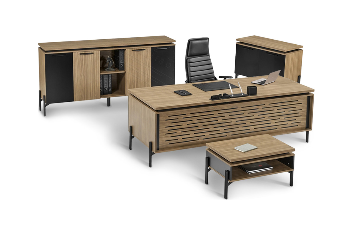 Score Yönetici Ofis Takımı, masa, dolap, etajer ve sehpadan oluşan modern ve şık bir yönetici takımıdır. Hepsi metal ayaklı tasarımıyla güçlü ve estetik bir görünüm sunarken, masanın önündeki yatay çizgili desenler kendine özgü yalın bir hava katar. Takım, modern ofislerde şıklığı ve fonksiyonelliği bir araya getirir.