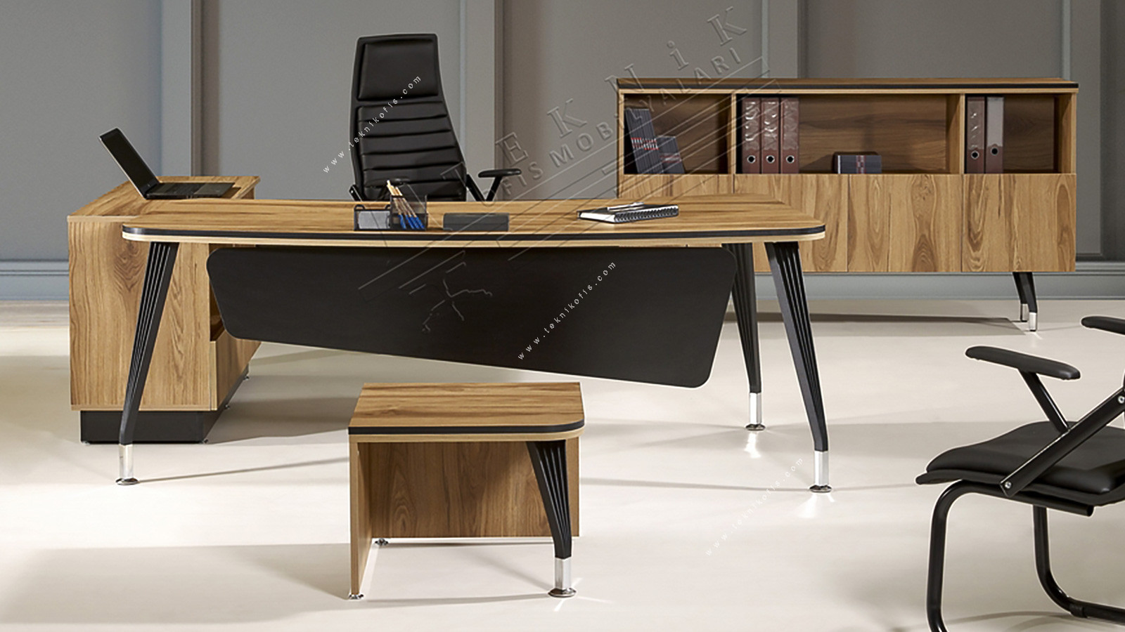 Takımın ana parçaları, geniş ve estetik bir yönetici masası, işlevsel bir depolama dolabı ve zarif bir sehpadan oluşur. Tüm parçalarda kullanılan ahşap tonları, mekana sıcak ve doğal bir hava katarken, antrasit ve metal detaylar modern bir kontrast oluşturur. Yüksek kaliteli malzemelerden üretilen yönetici odası mobilya takımı, dayanıklı yapısıyla uzun ömürlü bir kullanım vaat eder. Modern ve şık çizgileri, her türlü ofis dekorasyonuyla mükemmel bir uyum sağlayarak ortamın profesyonel imajını güçlendirir.