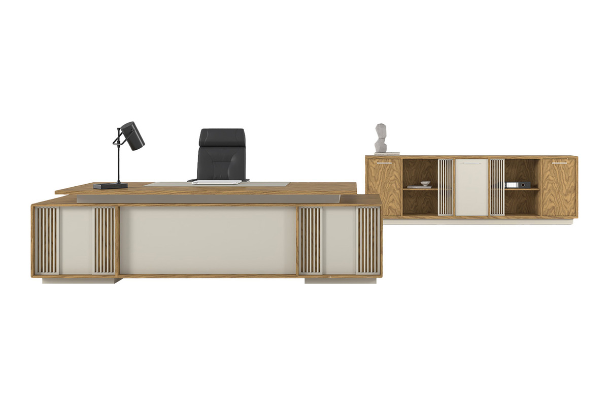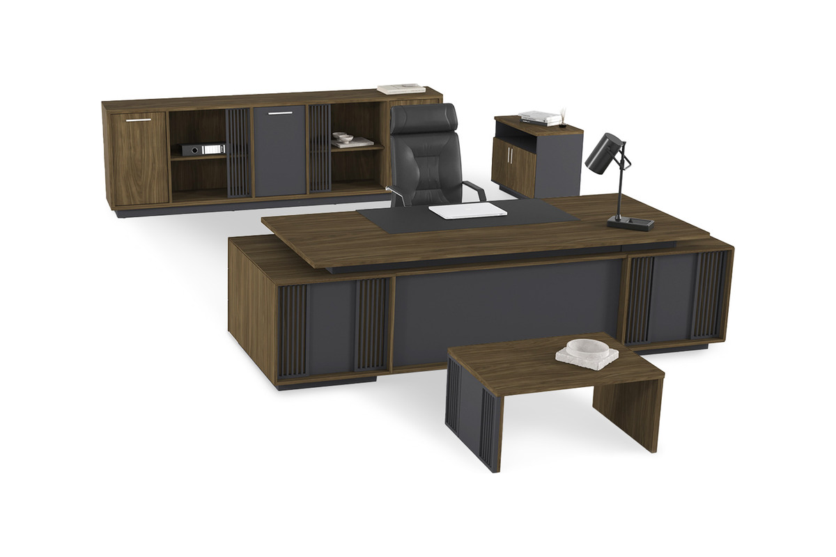 Takımın ana parçaları, bir makam masası, bir makam dolabı, bir etajer ve bir sehpadan oluşur. Masanın geniş çalışma yüzeyi ve dolabın kapsamlı depolama alanları, işlevselliği ön planda tutar. Etajer ve sehpa, takımın genel estetiğini tamamlarken, ek depolama ve kullanım kolaylığı sunar.