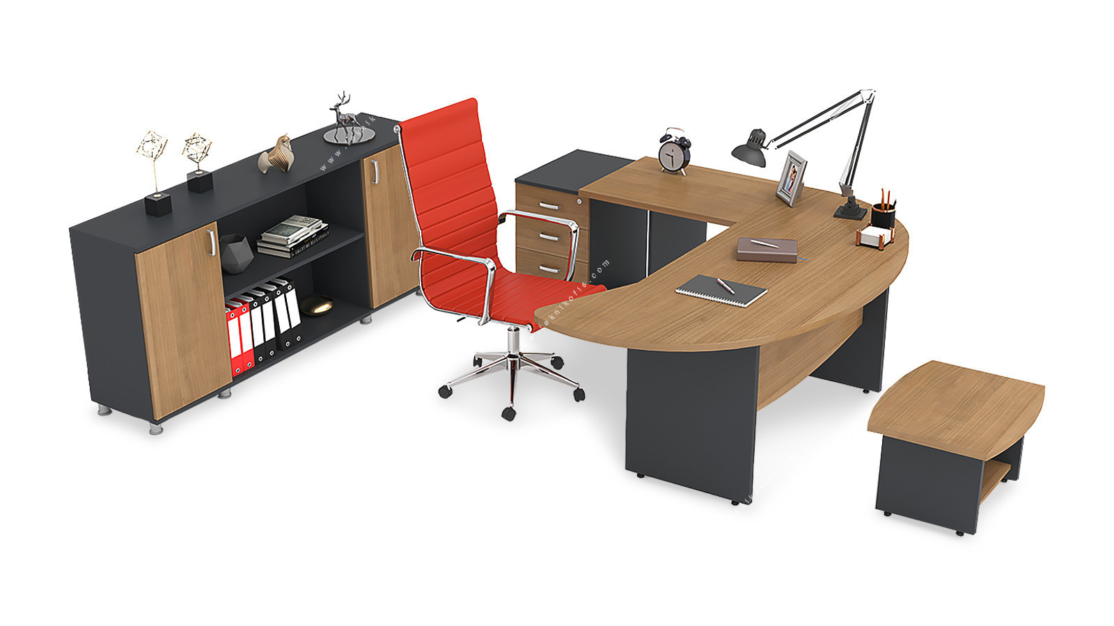 Stage Yönetici Takımı, modern ofis ambiyansına çağdaş ve dinamik bir estetik katmak üzere özel olarak tasarlanmıştır. Akıcı çizgileri ve masanın kavisli formu, takıma sanatsal ve yenilikçi bir hava kazandırır. İki farklı renkteki yüzeylerin birleşimi, takıma göz alıcı bir kontrast ve sofistike bir dokunuş sağlar.