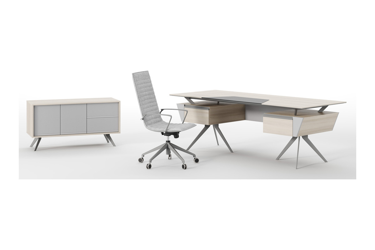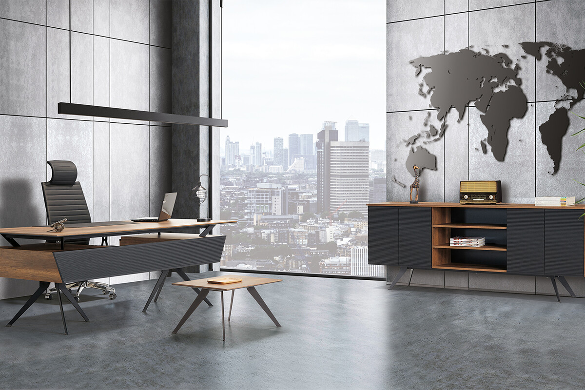 Stark makam yönetici mobilya takımı, metal ile ahşabı bir araya getirmiştir. Dökme metal takıma ayrı bir ambiyans katarken, ciddilik de kazanmıştır. Modern ve sportifliğinden de bir şey kaybetmeyen model, kullanıcısından tam not almayı başarmıştır. Ahşap detaylarının yer aldığı bölmelerde melamin malzeme kullanılmıştır. Siyah olarak gözüken yerler antrasit şeklinde metal materyal yer almıştır.