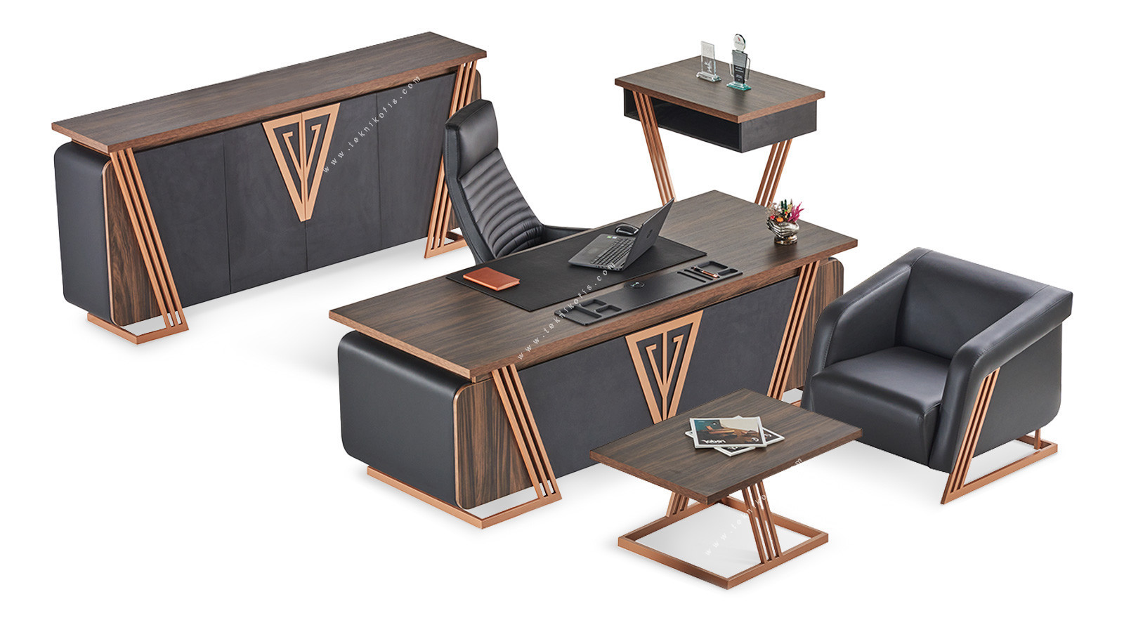 Tunç Şık Metal Ayaklı Makam Takımı, modern tasarımı ve dikkat çekici detaylarıyla ofisinize sofistike bir estetik ve güçlü bir karakter kazandırır. Takımın koyu tonları, mekana derinlik ve asalet katarken, özel tasarım metal ayaklar ve altın rengindeki detaylar, tasarıma dinamik ve lüks bir dokunuş ekler. Bu uyumlu renk ve malzeme kombinasyonu, ofisinizin genel atmosferini yükselterek çağdaş bir görünüm sağlar.