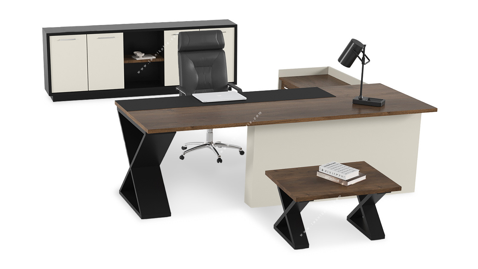 Takımın ana parçaları, geniş ve estetik bir yönetici masası, masaya entegre bir etajer, geniş depolama alanı sunan bir dolap ve şık bir sehpadan oluşur. Özellikle masanın ve sehpanın geometrik metal ayakları, takıma özgün ve dinamik bir karakter kazandırır. Modern ve şık çizgileri, her türlü ofis dekorasyonuyla mükemmel bir uyum sağlayarak ortamın profesyonel imajını güçlendirir. Ofis mobilyası takımı, işlevselliği, estetiği ve profesyonel görünümüyle yönetici ofisleri için ideal bir çözümdür.