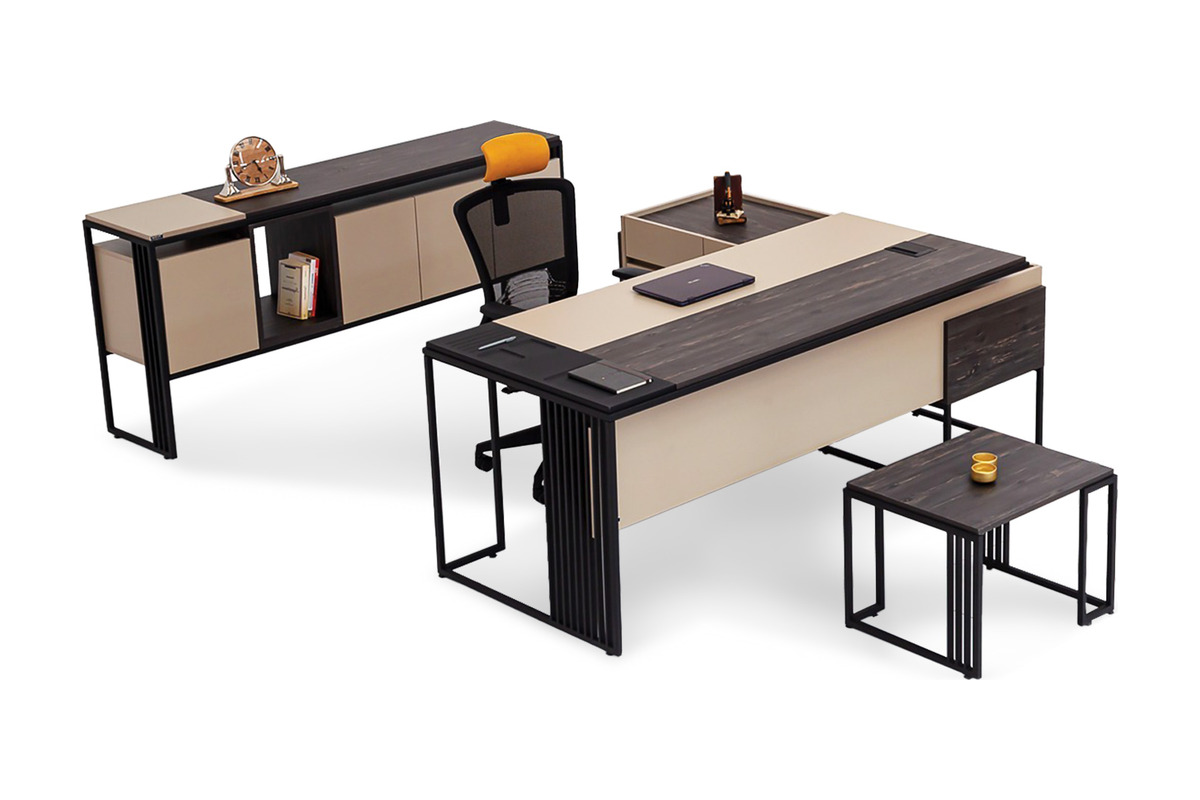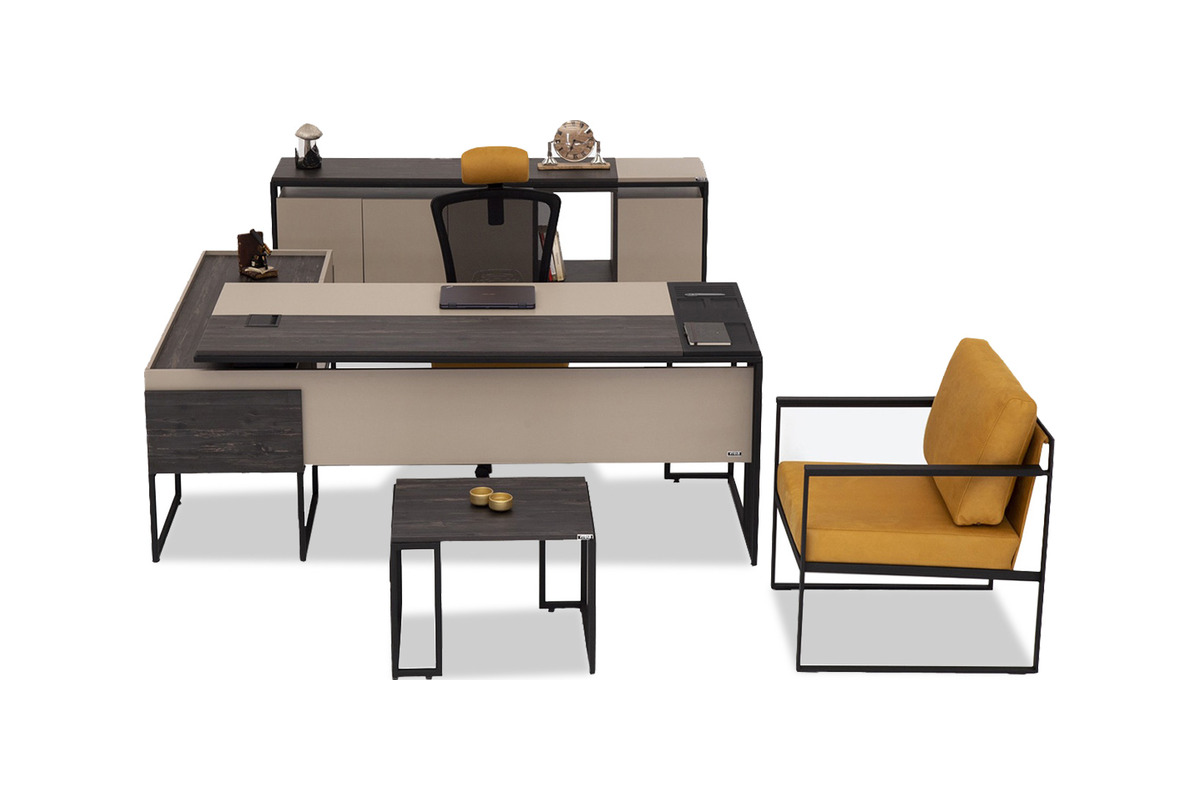 Vikos Ofis Mobilya Takımı, yönetici ofisleri için tasarlanmış, estetik ve verimliliği bir araya getiren kapsamlı bir settir. Takım, geniş ve entegre depolama çözümleri sunan yönetici masası, evrak ve kişisel eşyalarınızı düzenleyecek şık bir ofis dolabı, ve ofis misafirlerinizi ağırlarken kullanabileceğiniz zarif bir ofis sehpasından oluşur. Modern çizgileri, kaliteli malzeme seçimi ve uyumlu renk paletiyle ofisinize sofistike bir atmosfer katar. Vikos yönetici takımı, her detayıyla işlevselliği ön planda tutarak, yöneticilerin yoğun çalışma temposuna uyum sağlayan, düzenli ve ilham verici bir çalışma alanı çözümü sunar.