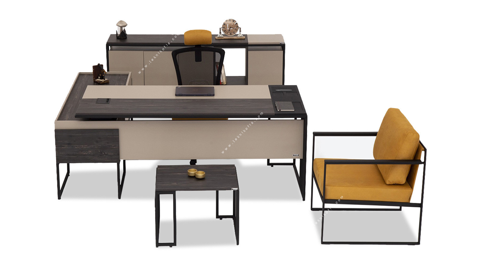 Vikos Ofis Mobilya Takımı, yönetici ofisleri için tasarlanmış, estetik ve verimliliği bir araya getiren kapsamlı bir settir. Takım, geniş ve entegre depolama çözümleri sunan yönetici masası, evrak ve kişisel eşyalarınızı düzenleyecek şık bir makam dolabı, ve ofis misafirlerinizi ağırlarken kullanabileceğiniz zarif bir makam sehpasından oluşur. Modern çizgileri, kaliteli malzeme seçimi ve uyumlu renk paletiyle ofisinize sofistike bir atmosfer katar. Vikos yönetici takımı, her detayıyla işlevselliği ön planda tutarak, yöneticilerin yoğun çalışma temposuna uyum sağlayan, düzenli ve ilham verici bir çalışma alanı çözümü sunar.