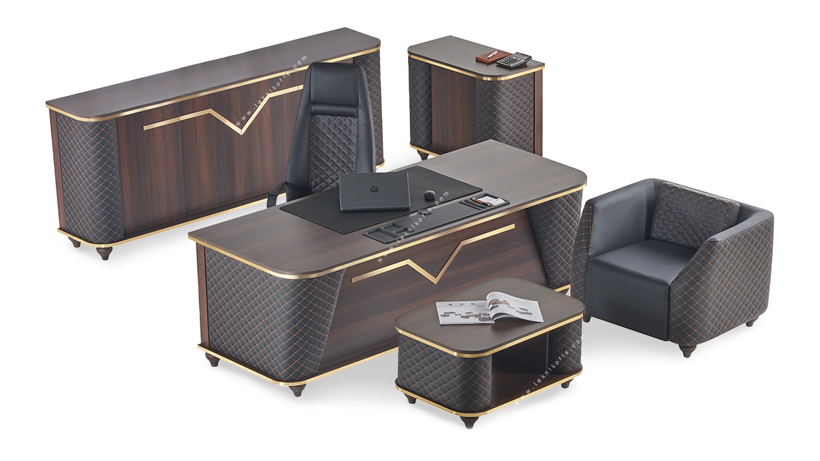 Takımın net çizgileri ve minimalist yapısı, modern ofis mimarisine mükemmel bir uyum sağlar. Masa, dolap, etajer, keson ve sehpanın birbiriyle olan şık birlikteliği, ofisinizde sanatsal bir denge ve düzen oluşturur. Bu lüks yönetici odası takımı, mekanınıza karakter ve modern bir zarafet katacaktır.