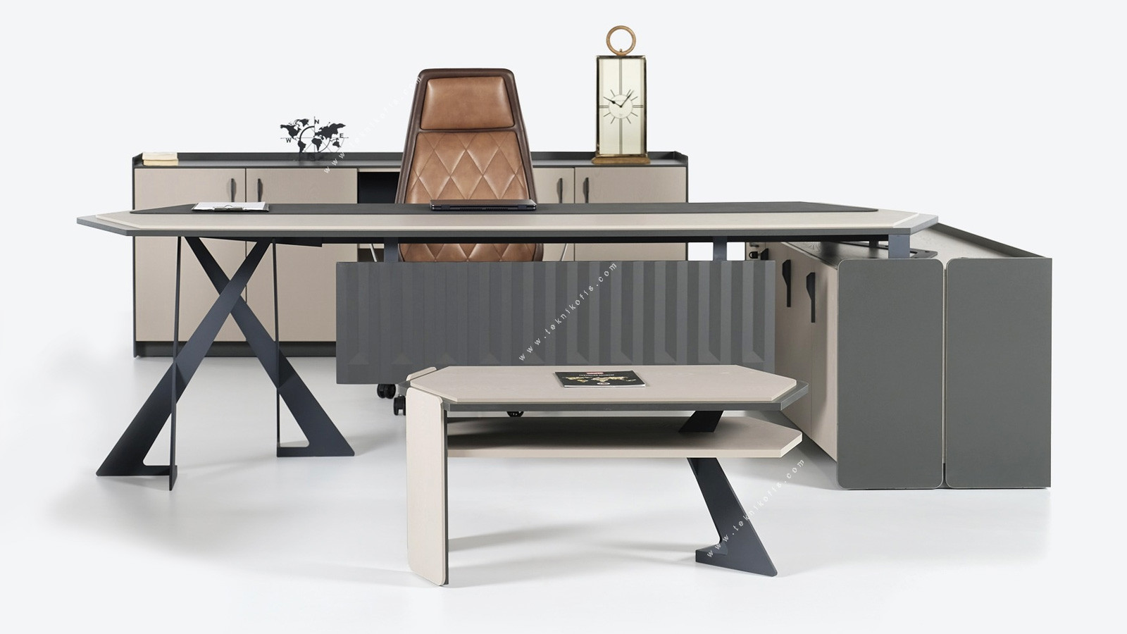 Wange Çapraz Metal Ayaklı Makam Takımı, ofisinizdeki yönetici odasına modern bir dokunuş ve etkileyici bir çalışma ortamı kazandırmak üzere tasarlanmıştır. Takım, geniş çalışma yüzeyi sunan bir makam masası ve düzenli depolama sağlayan bir dolaptan ve sehpadan oluşur. Parçalarda yer alan belirgin çapraz metal ayaklar, tasarıma endüstriyel bir şıklık katarken, üstün sağlamlık ve denge sunar. Ahşap görünümlü yüzeyler ve metal detayların uyumu, ofisinizin genel estetiğine kolayca uyum sağlar ve ferah bir atmosfer yaratır. Kaliteli malzemelerden üretilmiş olması, uzun ömürlü ve dayanıklı bir kullanım vaat eder. Wange modern makam takımı, hem estetiği hem de işlevselliği bir araya getirerek, yöneticiler için ilham verici ve verimli bir çalışma deneyimi sunar.