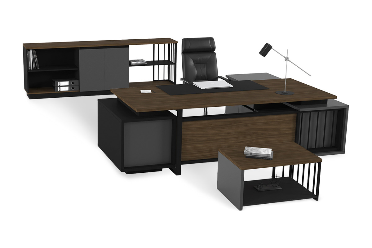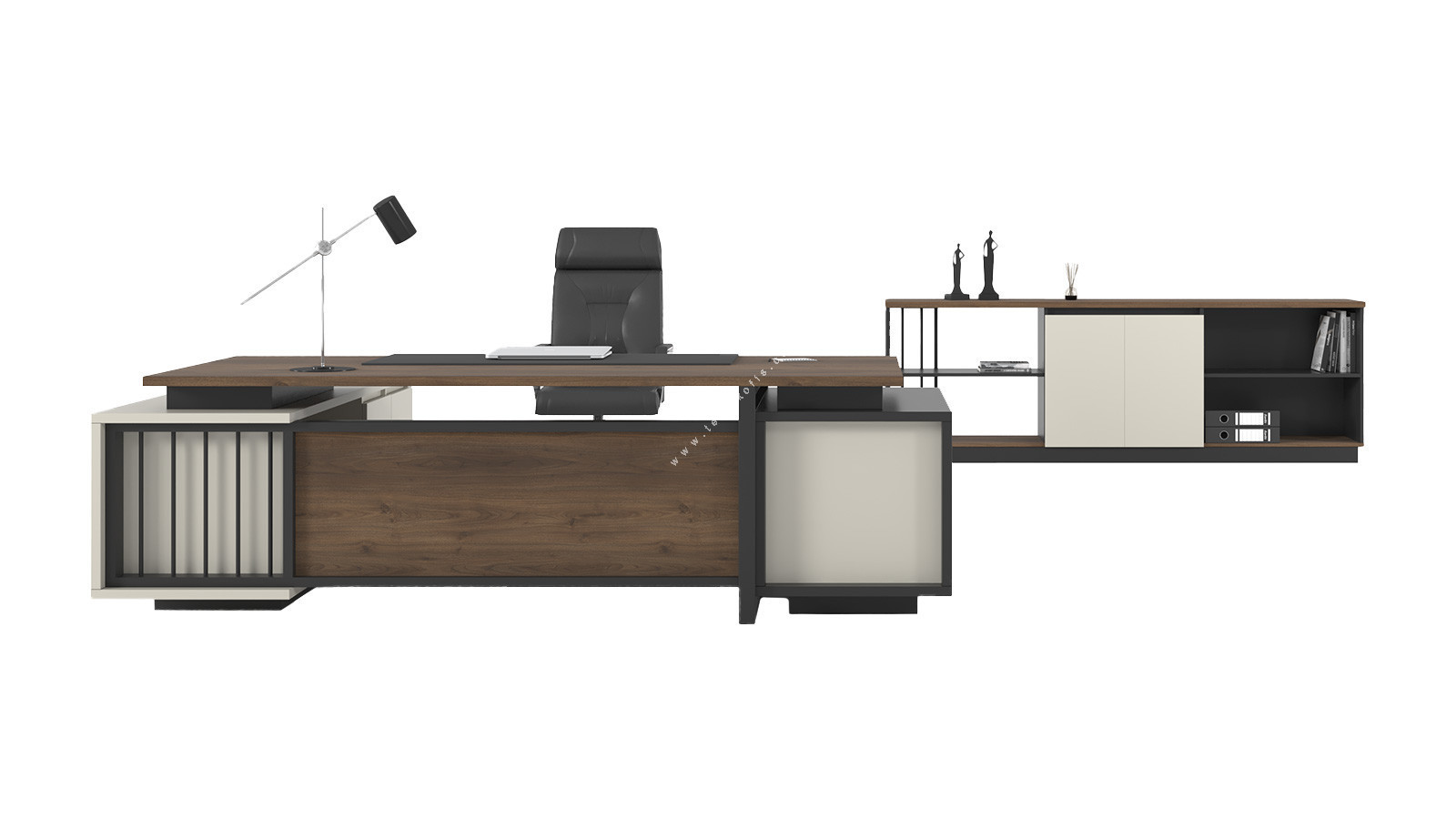 Zayra Ofis Masa Takımı, yönetici ofisleri için estetik ve işlevselliği ön planda tutan bir dizayna sahiptir. Bu kapsamlı mobilya takımı, geniş bir yönetici masası, ona eşlik eden bir yönetici dolabı ve uyumlu bir yönetici sehpasından oluşmaktadır. Masanın entegre etajeri ve dolabın çok yönlü bölmeleri, tüm ofis malzemelerinin düzenli bir şekilde saklanmasına olanak tanır. Bu sayede, çalışma alanınızda hem düzeni sağlar hem de şık bir görünüm sunar.